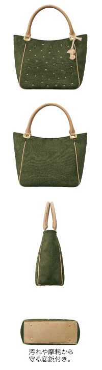 やさしいスエード調のオリーブグリーンに、きらめく旬のスタッズ。